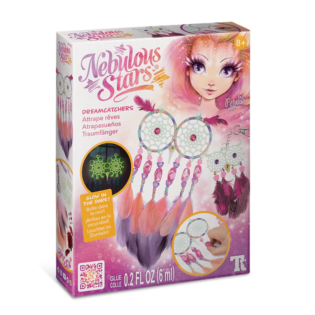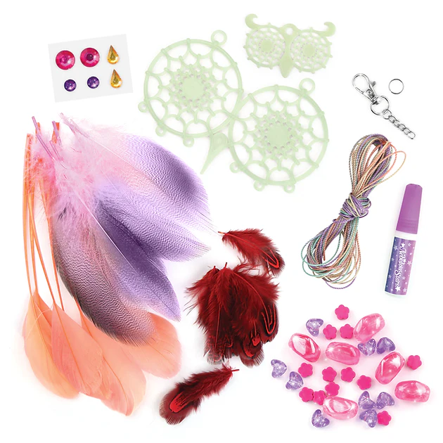 Inclus : 2 bases d’attrape-rêves, fil en coton, 18 plumes, 27 perles, 6 strass autocollants, colle à bijoux, 12 points de colle, anneau pour porte-clés avec chaînette, anneau, l’histoire complète de Petulia, instructions en couleur