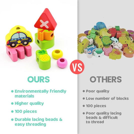 Perles d’Enfilage en Bois – 100 Blocs Éducatifs (Chiffres, Fruits, Véhicules)