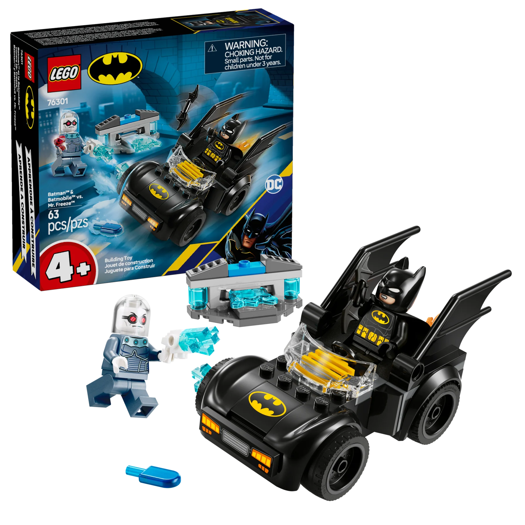 Le set inclut une Batmobile à construire, pouvant accueillir la minifigurine de Batman™, ainsi que les figurines de Mr. Freeze™ et Batman™. Les enfants peuvent tirer des éléments glace avec le lanceur ou utiliser le bâtonnet glacé de Mr. Freeze™. Deux diamants de glace peuvent être placés sur la Batmobile™ pour simuler un blocage, permettant de nombreuses mises en scène. Le guide illustré et les sachets de briques séparés assurent une construction rapide et intuitive, parfaite pour les jeunes constructeurs.