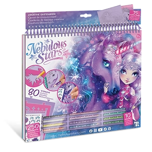 Contenu : toile imprimée en couleur, 14 peintures acryliques, 2 pinceaux, vernis pailleté, variété de strass, instructions de coloriage et histoire de Nébulia