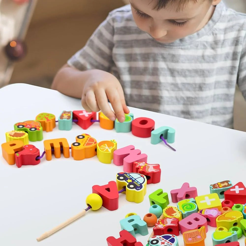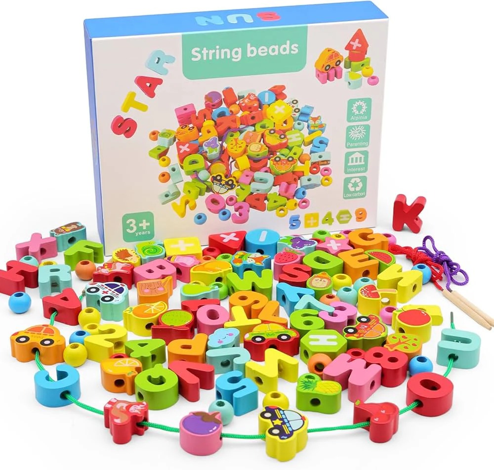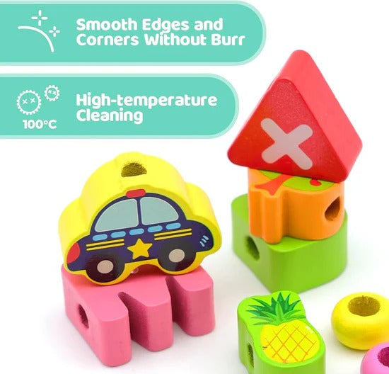 Perles d’Enfilage en Bois – 100 Blocs Éducatifs (Chiffres, Fruits, Véhicules)
