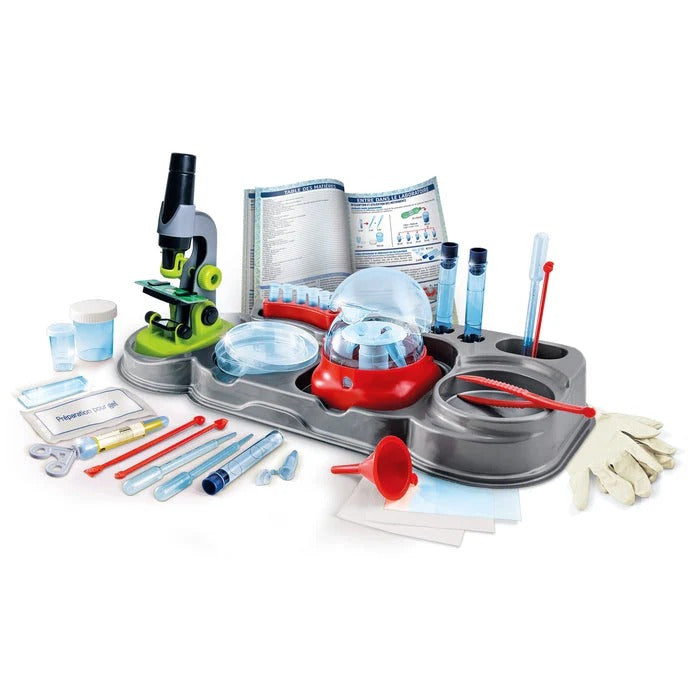 Avec de vrais instruments comme un microscope et une centrifugeuse, ainsi que de nombreux accessoires, les enfants explorent la chimie, la microbiologie, la physique et la génétique.