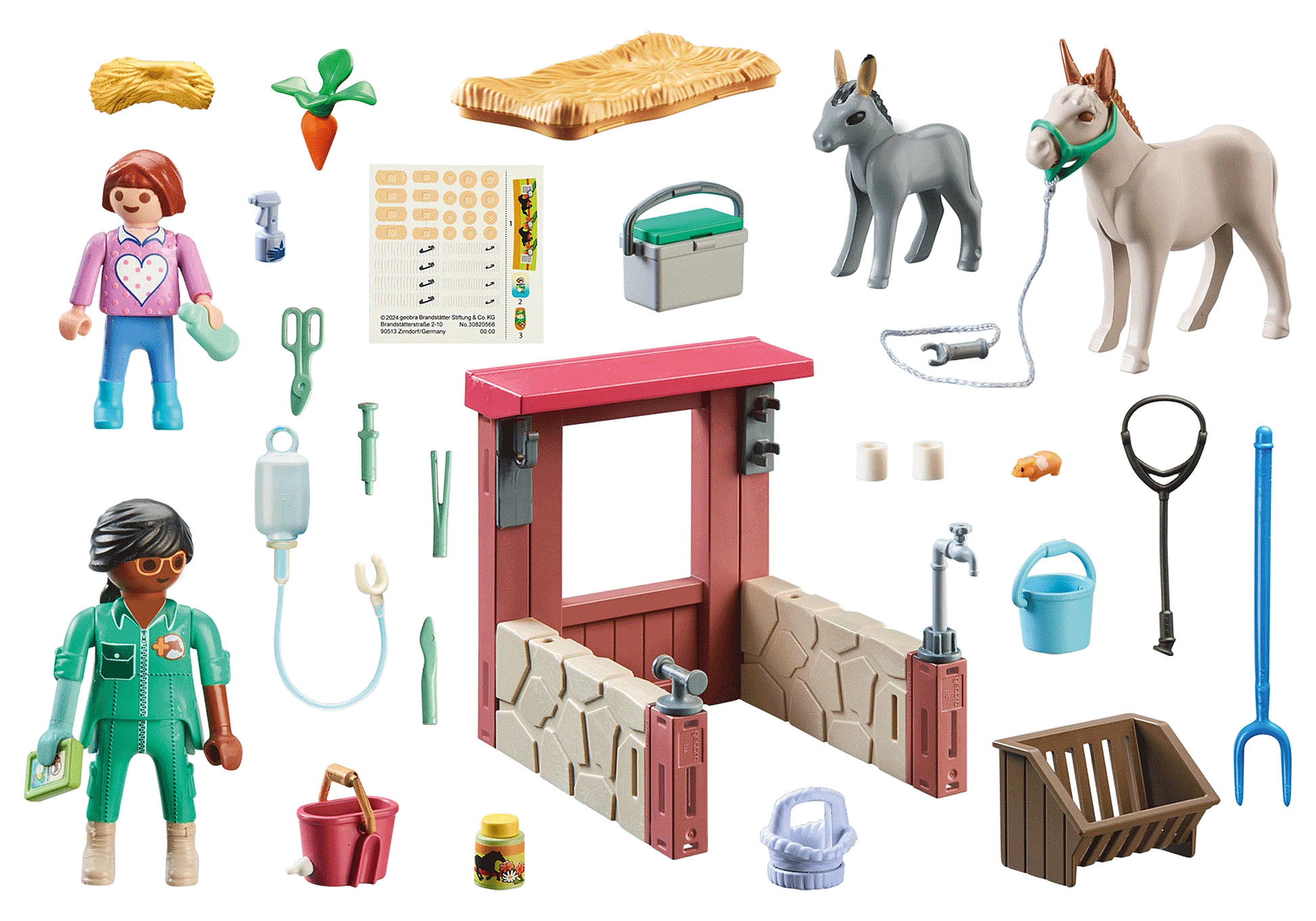 Avec le set Vétérinaire avec animaux de la ferme PLAYMOBIL (71471), les enfants dès 4 ans plongent dans l’univers de la ferme et des soins aux animaux. L’âne et son poulain ont besoin d’attention, et la vétérinaire est là pour les examiner avec son équipement complet. Ce coffret inclut également un petit hamster, un abri pour soigner les animaux et de nombreux accessoires, pour des jeux de rôle réalistes et éducatifs. Fabriqué avec plus de 80 % de matériaux recyclés ou biosourcés, ce set combine plaisir de jouer et respect de l’environnement.